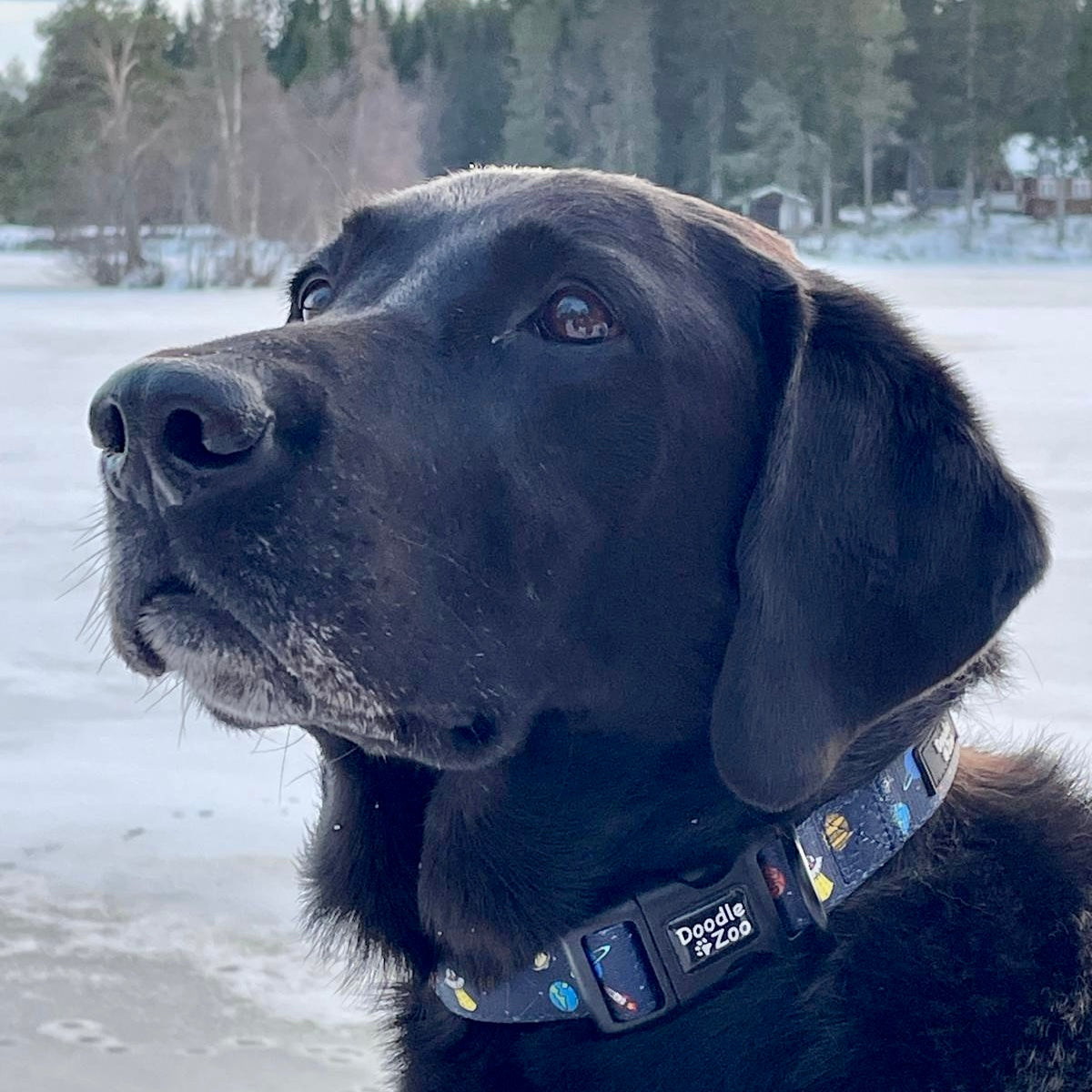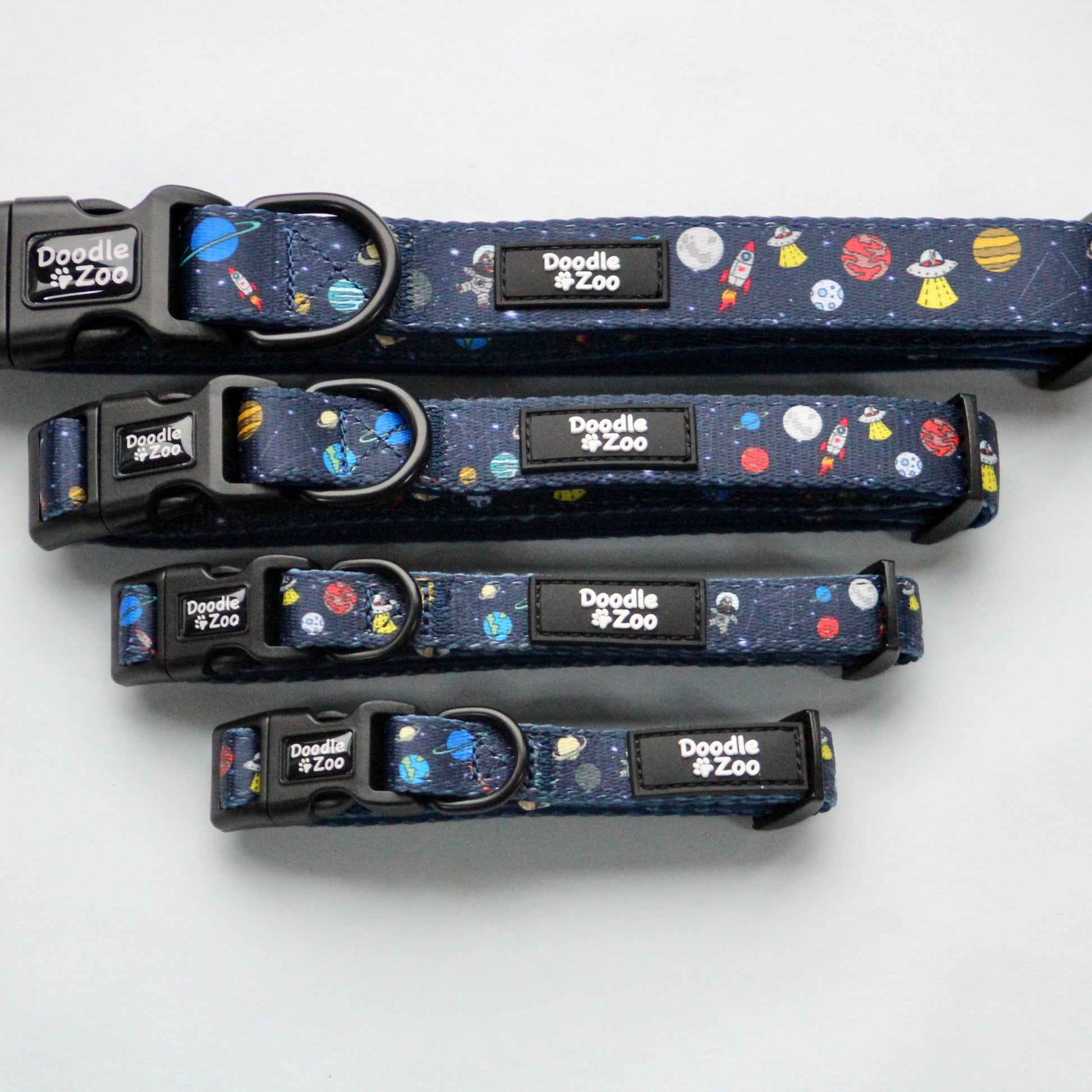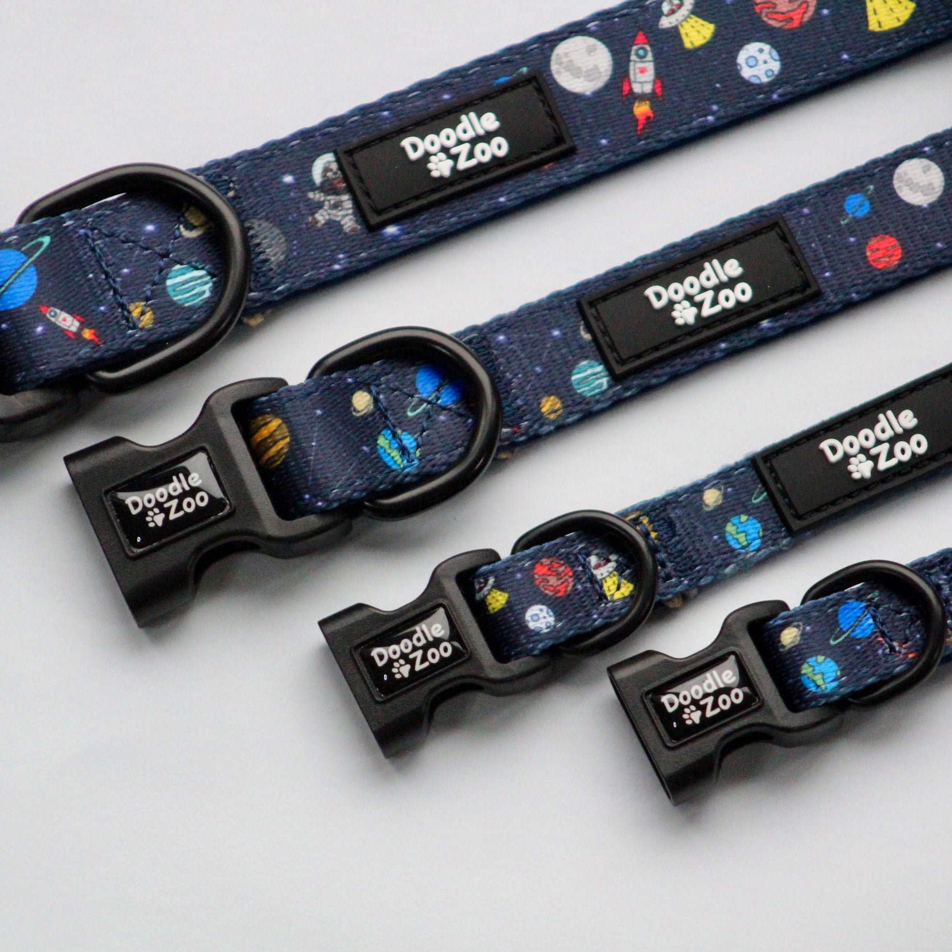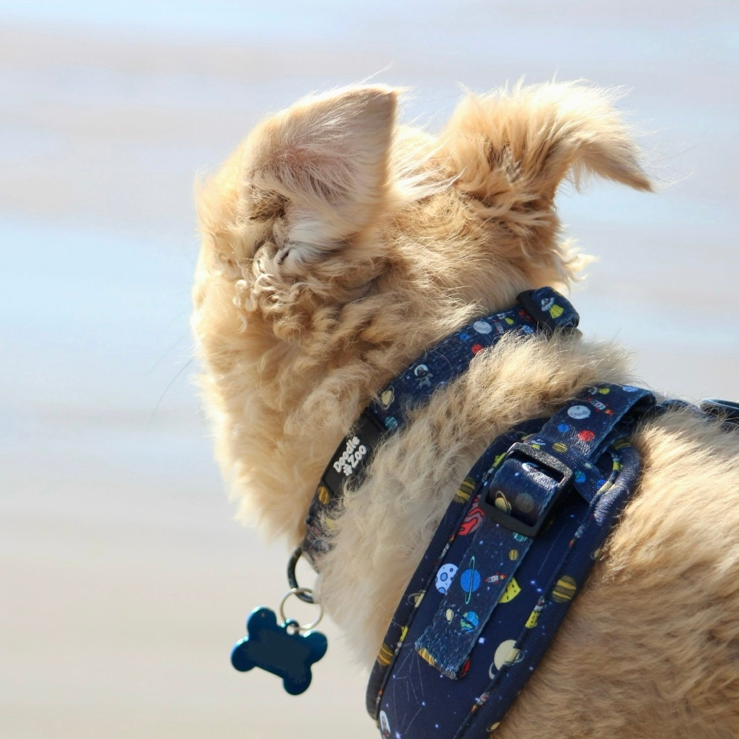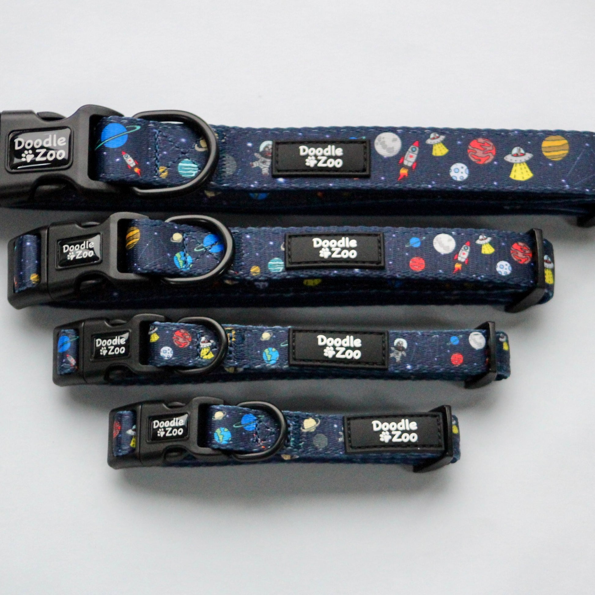 Bring a touch of space to your daily walks with our Out of This World design. This cosmic patten is designed for dogs who are always ready for an adventure. Featuring a deep midnight-blue base scattered with dog astronauts, rockets, and colourful planets, this playful yet stylish design is perfect for pups who love to stand out from the crowd.
