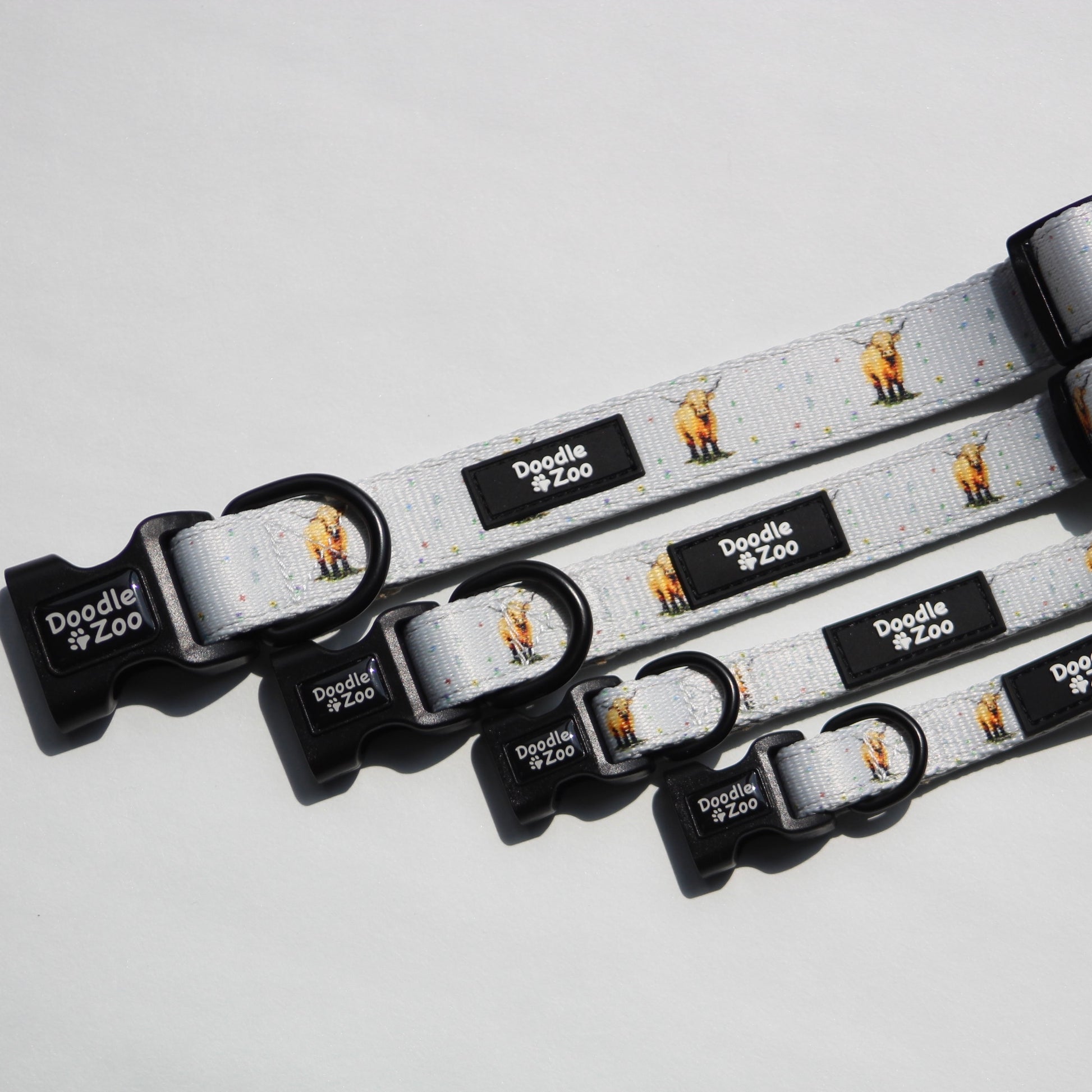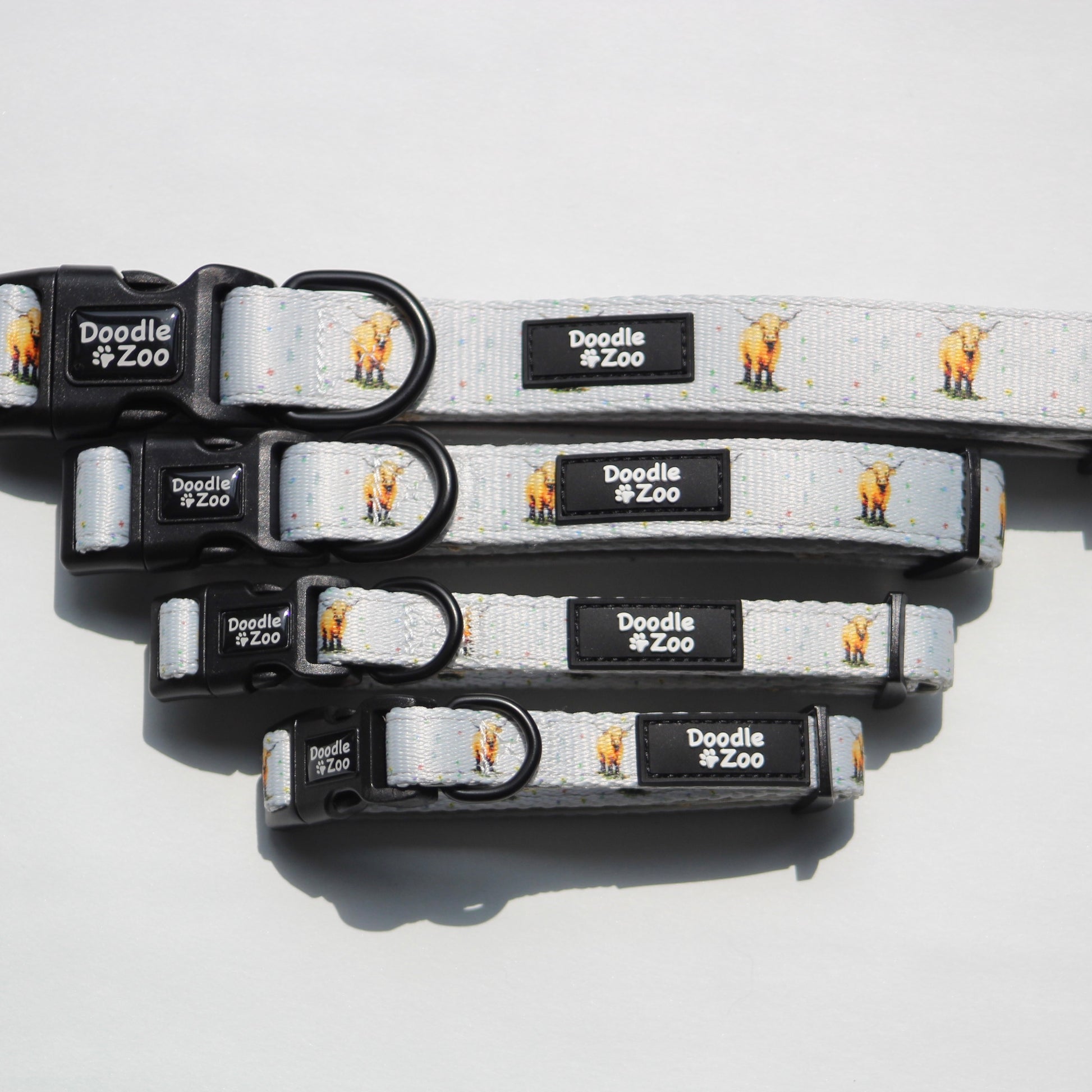 Get Moovin’ is a playful countryside-inspired print that brings a little Highland charm to your pup’s wardrobe. Featuring adorable Aberdeen Angus cows on a light grey backdrop sprinkled with colourful confetti-style flowers, it’s full of character and joy. Perfect for dog lovers who adore a quirky rural vibe with a modern twist, this cheerful design is sure to turn heads on every walk!